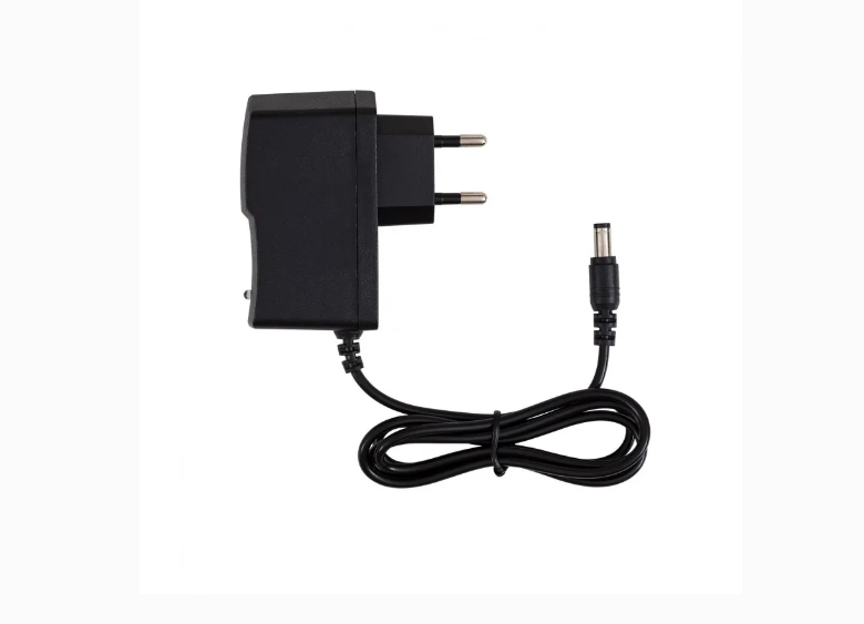 Carregador AC/DC preto com ficha de dois pinos redondos e cabo