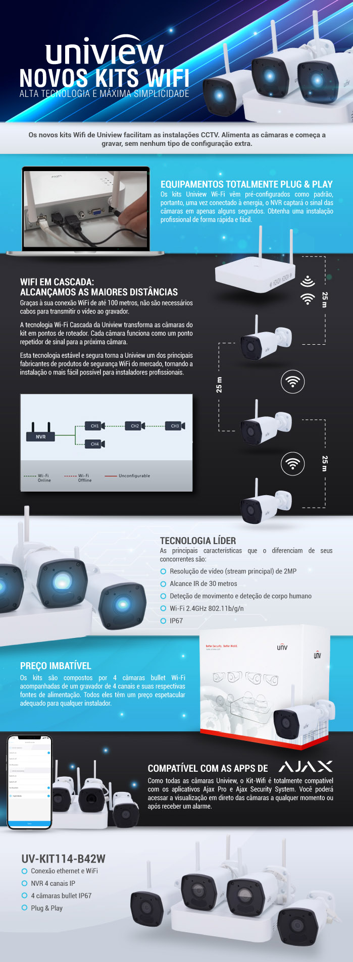 Tal como todas as câmaras Uniview, este Kit Wifi é totalmente compativel com os aplicativos ajax pro e Ajax Security System que permitem aceder ás imagens das câmaras em direto, a qualquer momento ou após receber um alarme.